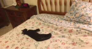 Afterwards, they watched a movie. When it was time for bed all five of us went to the master bedroom. I played on the floor under the rolled back bedspread until Mis M’lu got in bed with her book. I climbed up with her and started playing with the mouse she was tossing around. Just as I had laid down to sleep M’ster Doc came to the bed.